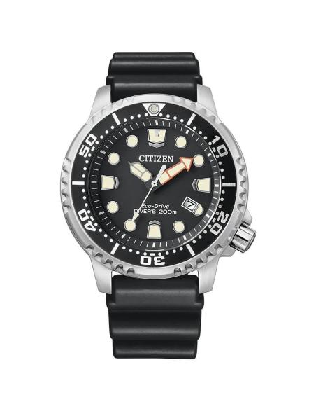 Reloj Citizen Eco Drive BN0150-10E Diver 200m, que pertenece a la colección Promaster de la marca japonesa. Cuenta con el Sistema Eco Drive E168,con carga de luz infinita que no necesita cambio de pila; su reserva de carga es de 180 días. Posee un bisel giratorio unidireccional en negro a juego con su correa de caucho. El cristal que lleva el reloj es de mineral hardlex. La caja es de acero de 44mm con fondo y corona cerrados a rosca.